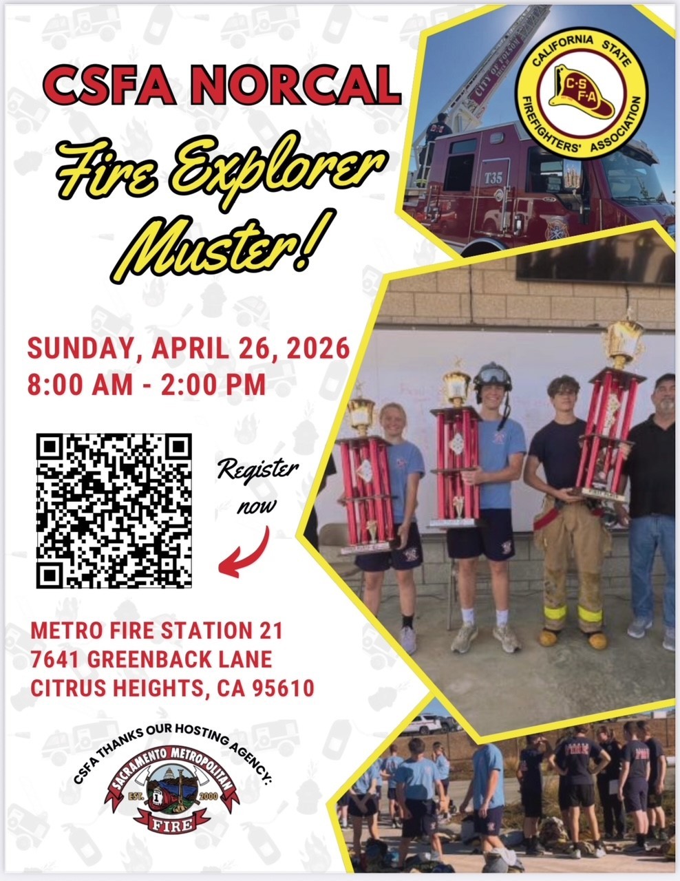 Looking for something to on Sunday April 26th ? 9 to 2 ish. Consider attending CSFA NORCAL Fire Explorer Muster in Partnership with Sac Metro – Open to any Fire Tech student under 20 years old enrolled in Fire Explorer Programs/ Fire CTE -ROP Programs or Fire Technology Programs in our colleges.